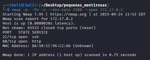 nmap -p- -Pn -n --min-rate 2500 --open 172.17.0.2