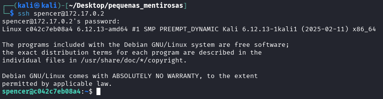 Encontramos la contraseña del usuario «spencer». Vamos a tratar de acceder al sistema a través de SSH con las nuevas credenciales encontradas.