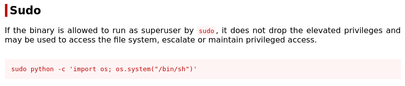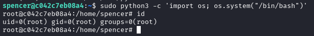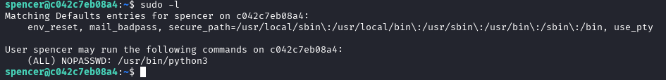 Después de ejecutar el comando sudo -l, vemos que el usuario spencer puede ejecutar el binario python3 con privilegios sin necesidad de contraseña. Consultamos la Web GTFOBins, como elevar privilegios aprovechando el vector descubeirto.
