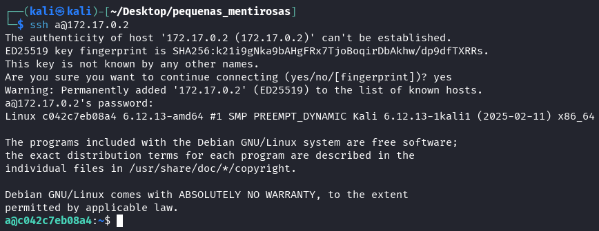 Encontramos la contraseña para el usuario «a». El siguiente paso es tratar de conectar al objetivo con las credenciales obtenidas a través de SSH.
