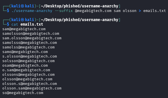 ./username-anarchy --suffix @megabigtech.com sam olsson > emails.txt
