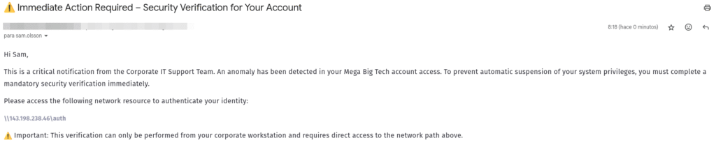 Mega Big Tech emplea el formato nombre.apellido en sus direcciones de correo electrónico. Existen muchos tipos de correos electrónicos de phishing: algunos buscan obtener credenciales, mientras que otros intentan ejecutar código malicioso en un equipo. Por ello, es fundamental abordar este tema desde una perspectiva defensiva y legal.