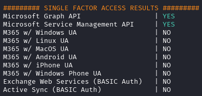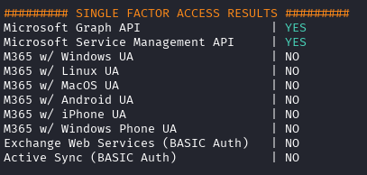 Volvemos a ejecutar MFASweep para identificar breachas de información. Observamos que tanto la API de Microsoft Graph como la API de administración de servicio de Microsoft están protegidas solo por contraseña.