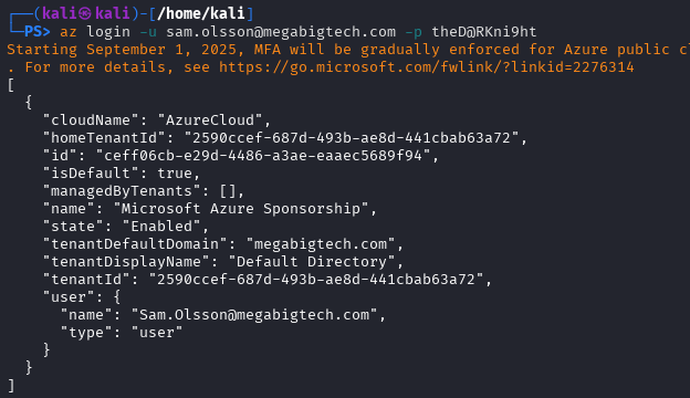 az login -u sam.olsson@megabigtech.com -p theD@RKni9ht