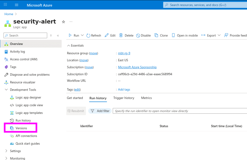 Al hacer clic en la versión existente, vemos la ejecución que realiza la aplicación. Esta aplciación realiza una acción HTTP en el momento de recibir un correo electrónico.