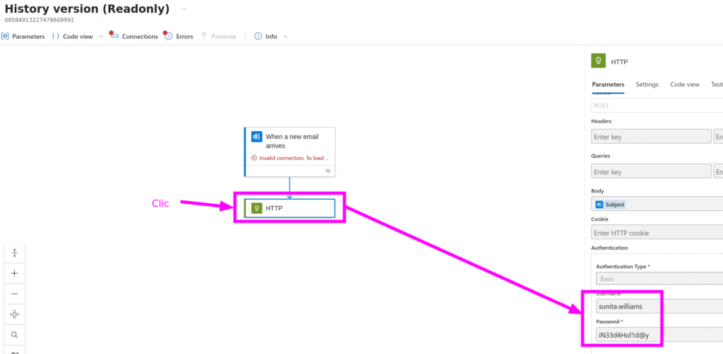 Al inspeccionar la acción HTTP, vemos unas credenciales usadas para acceder a una aplicación de Azure con tipo de autenticación Basic.