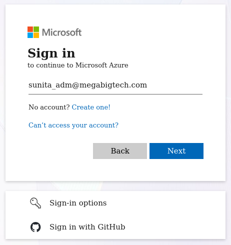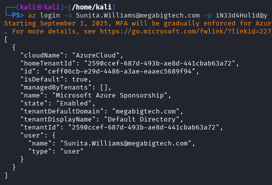 Iniciemos sesión en la CLI de Azure con las credenciales de Sunita y obtendremos acceso correctamente.
