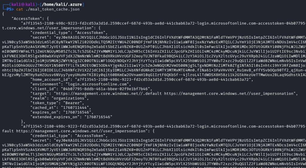 A continuación, recuperaremos el refresh token navegando al directorio /azure en nuestro equipo de ataque. Buscaremos el archivo msal_token_cache.json