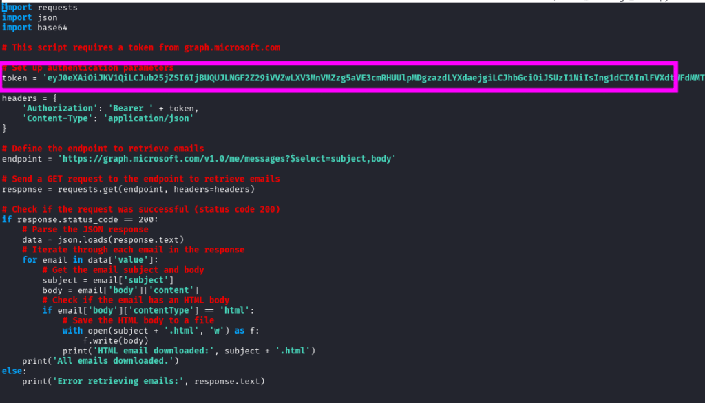 Añadimos el token obtenido anteriormente en el script exfil_exchange_mail.py