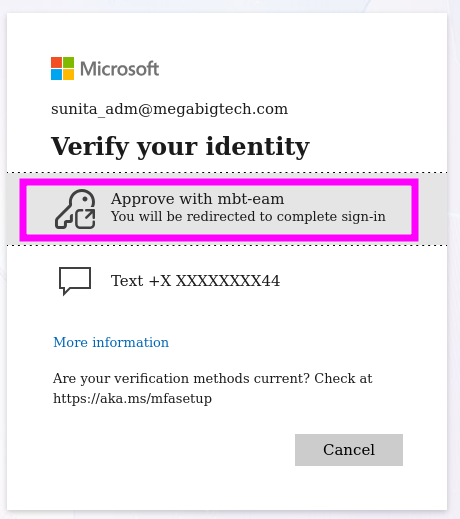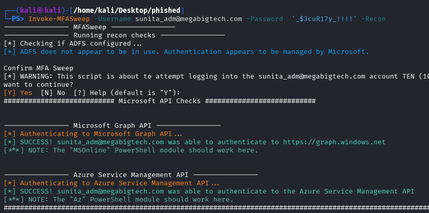Invoke-MFASweep -Username sunita_adm@megabigtech.com -Password  _$3cuR17y_!!!! -Recon